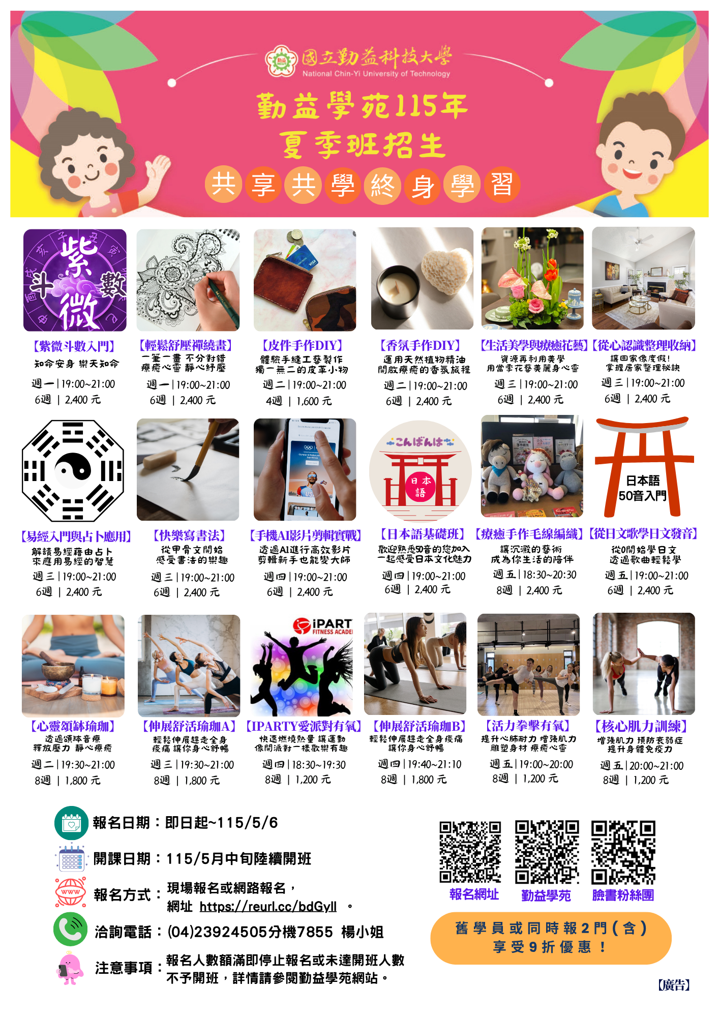 國立勤益科技大學勤益學苑【115年夏季班】招生簡章及報名資訊